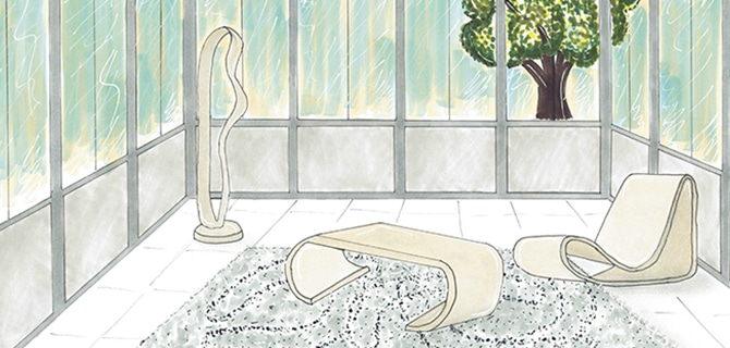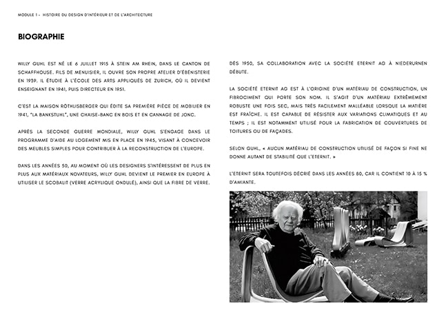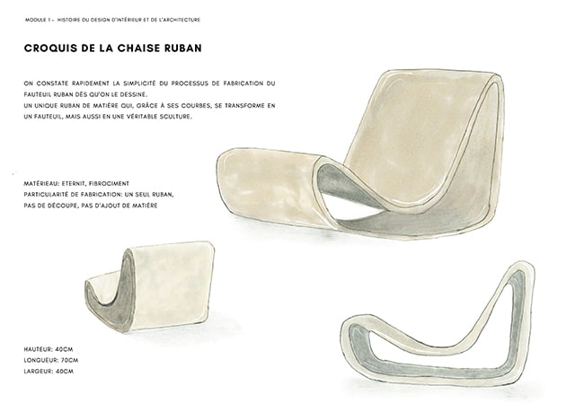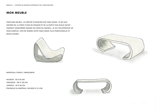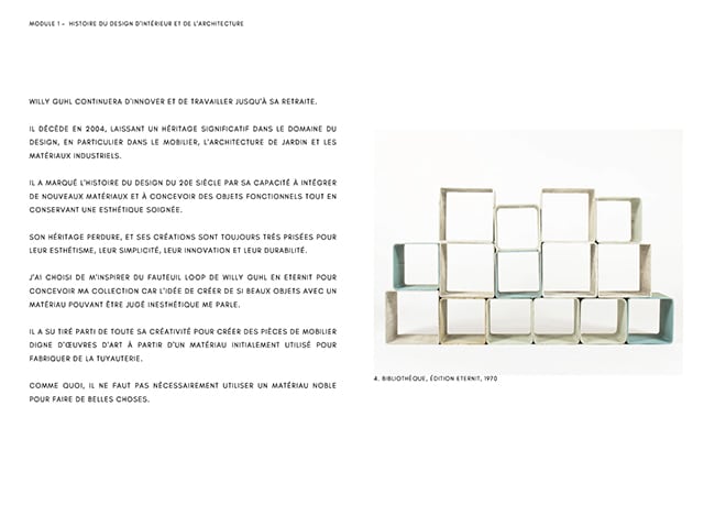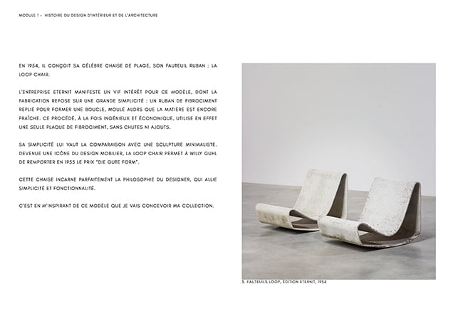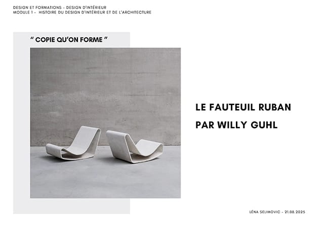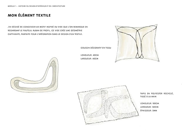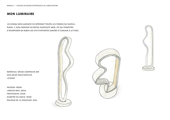 Voici le travail réalisé par notre étudiante Léna, pour le Projet N°2 de notre formation en Design d’Intérieur. Intitulé « Copie qu’on forme », celui-ci consiste à s’inspirer d’une oeuvre d’un designer reconnu et imaginer une collection d’objets, pour un éditeur ou un fabricant de meubles. Léna a choisi de travailler autour du fauteuil ruban « Loop Chair » du designer Willy Guhl afin de créer une collection de trois éléments : un meuble, un luminaire et un textile. Notre étudiante a su analyser avec pertinence les codes utilisés par le designer pour les réinterpréter dans ses 3 créations originales. Bravo pour ce travail !