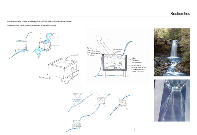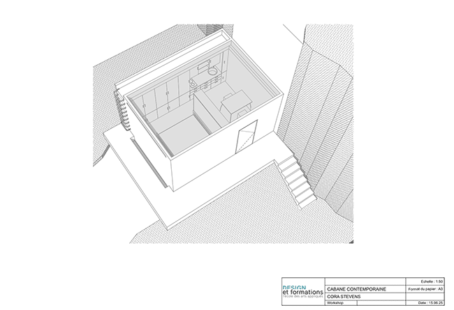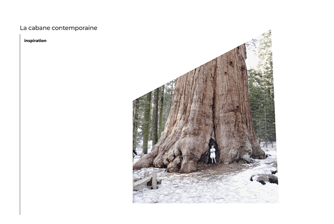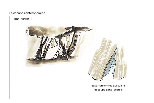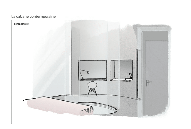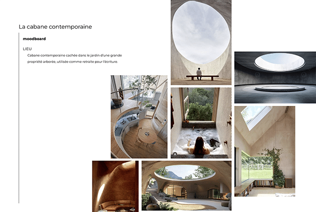 Marjolaine a quant à elle proposé une “cabane cachette” : elle a imaginé une cabane contemporaine dissimulée dans le jardin d’une grande propriété arborée. Pensée comme une retraite dédiée à l’écriture, elle se niche dans la nature telle une cachette secrète, à l’intérieur même d’un arbre. Un refuge intime pour se retirer, réfléchir et laisser naître les mots.