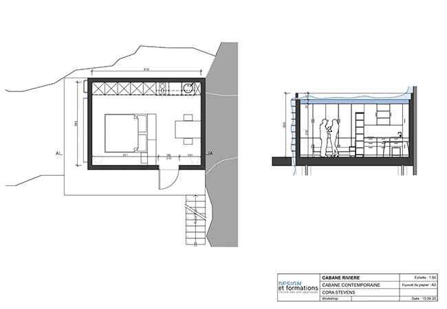 Cora a conçu une “cabane rivière” : un concept singulier pour l’aménagement de cette petite cabane. Posé directement sur le cours de la rivière, le projet s’ancre dans le paysage avec délicatesse. Malgré sa taille modeste, il offre un réel confort de vie ainsi que toutes les commodités nécessaires à ses utilisateurs.